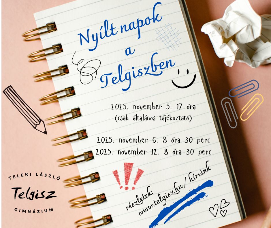 Iskolánk az idei tanévben is két alkalommal szervez nyílt napot. A sikeres lebonyolítás érdekében regisztrációhoz kötött a jelentkezés a telgisz.nyiltnap@gmail.com e-mail címen. A részvételi létszám 75 fő. Az óralátogatásokra való jelentkezés az általános tájékoztatón történik.